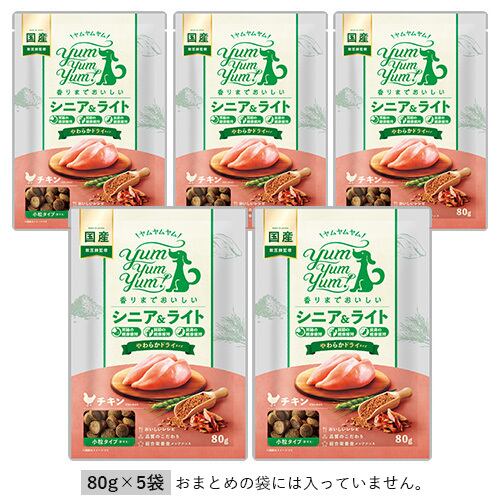 yum yum yum! やわらかドライタイプは、通常のドライフードよりも水分を多く含んだしっとり食感が特長です。ドライタイプと原材料は同じですが、それ以上に香り高く、一層おいしく味わえます。保湿剤・保存料は不使用です。